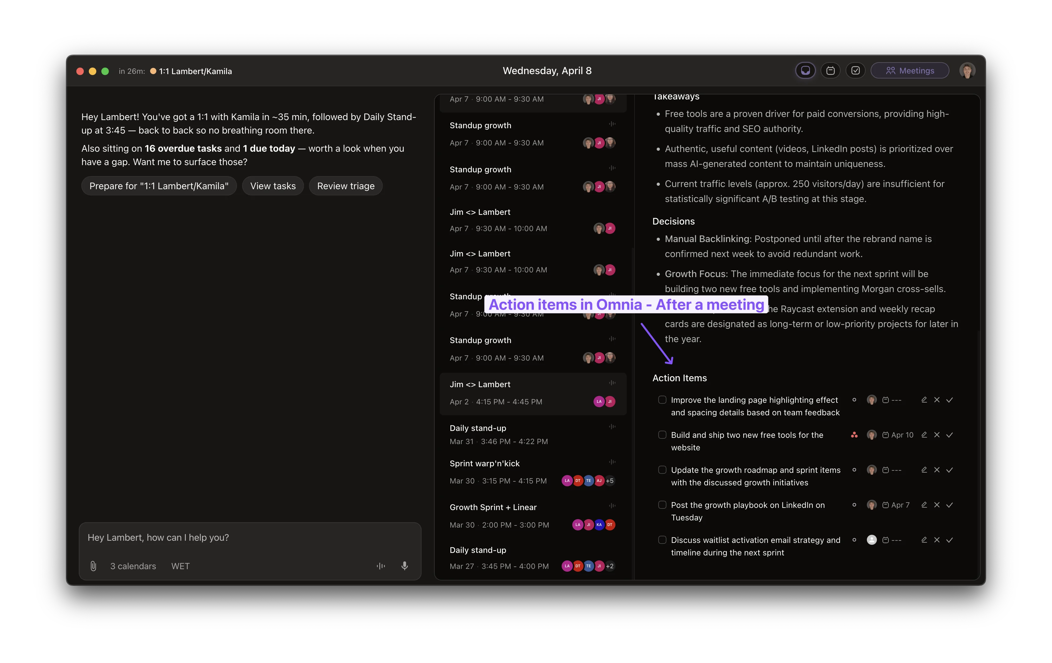 Omnia is an AI executive assistant. It captures meetings botlessly, extracts action items with assignees and due dates, and routes them into your task system, your calendar and your inbox. Same idea as Granola's hybrid notes. But instead of producing a polished summary that lives in another app, it produces work that lands where work already happens. See the meeting action items workflow for how it actually chains through.
