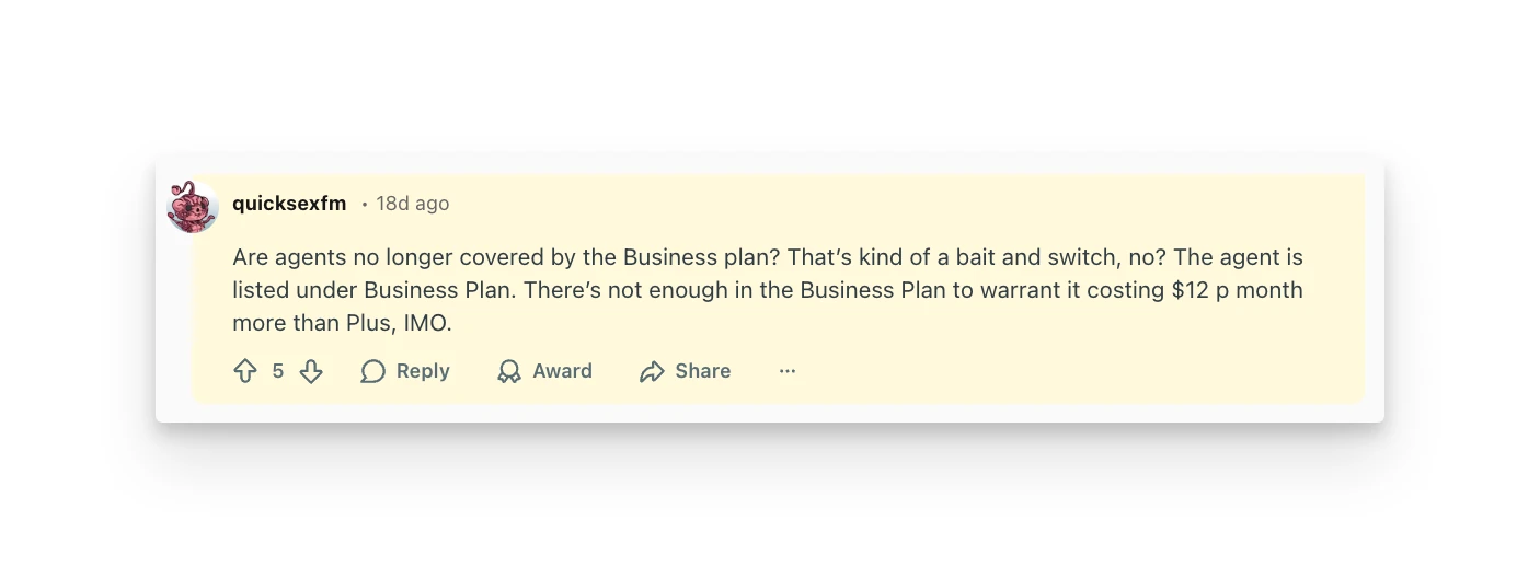 "Are agents no longer covered by the Business plan? That's kind of a bait and switch, no?" — u/quicksexfm, Reddit