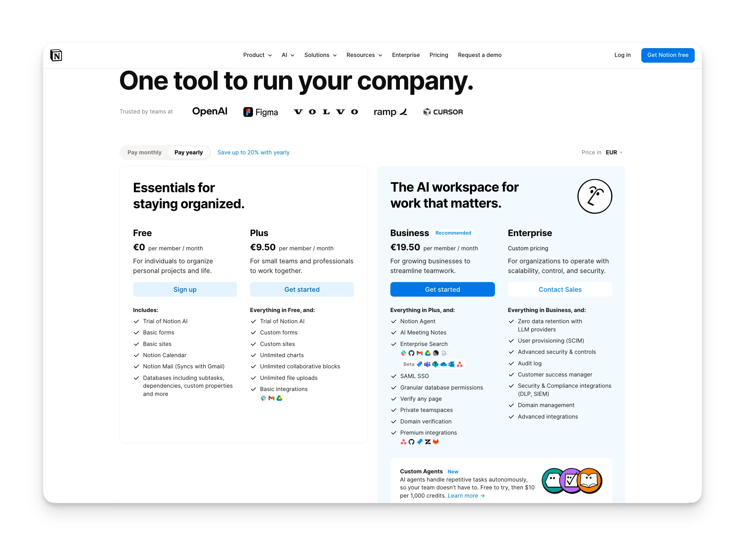 Notion uses per-user, per-month pricing across four tiers. Paying annually saves roughly 20%.