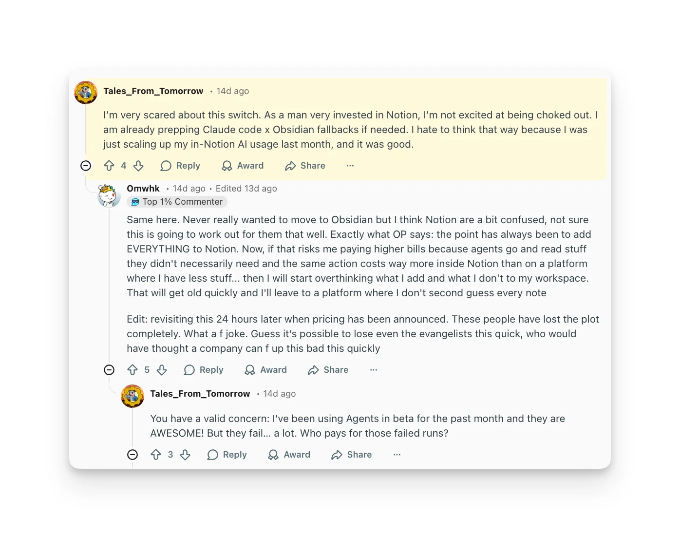 "I'm very scared about this switch. As a man very invested in Notion, I'm not excited at being choked out. I am already prepping Claude code x Obsidian fallbacks if needed." — Reddit review, 2026