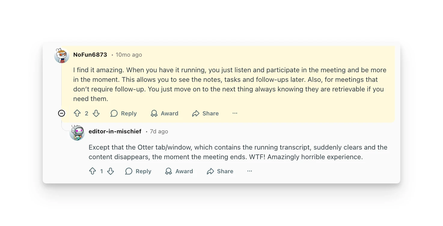 The summary quality is a mixed bag. In a detailed Reddit comparison, one user described Otter's post-call insights as "simple but generic meeting summary" and rated action item detection at just 2 out of 4 stars, calling it "basic detection" compared to competitors.