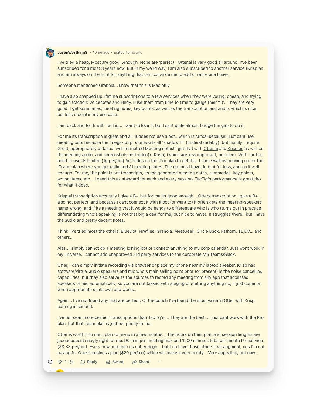 "Otter.ai is very good all around. I've been subscribed for almost 3 years now." — Reddit review, 2025