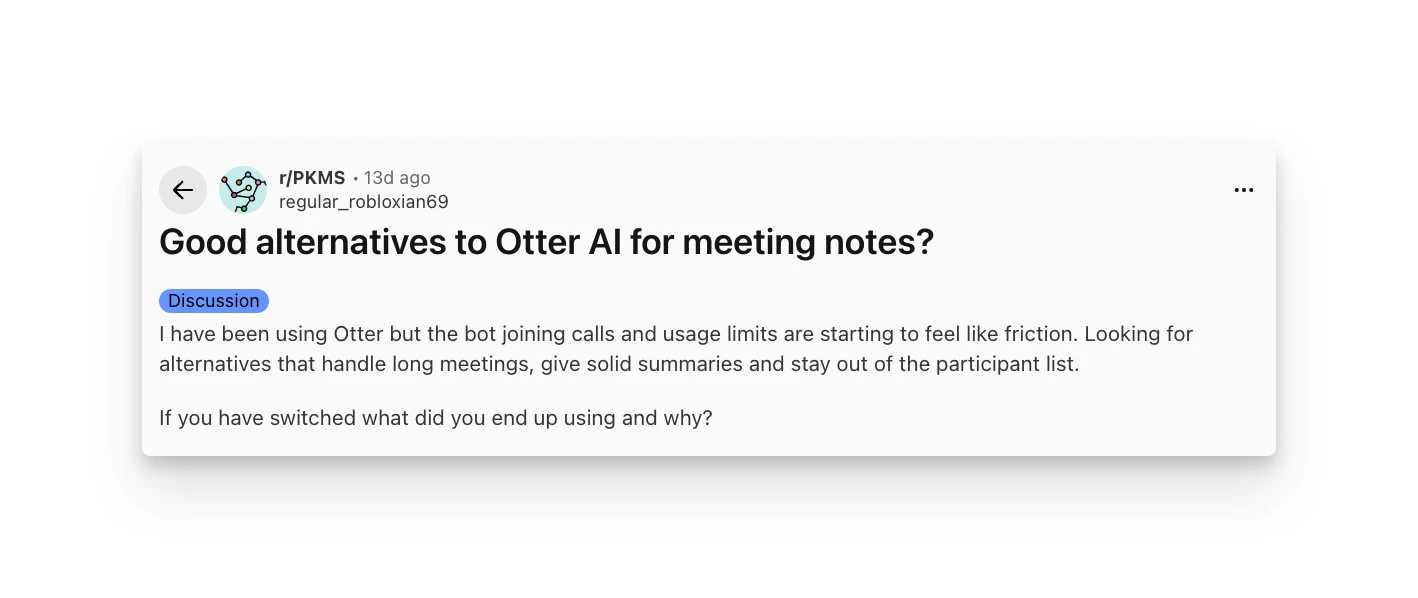 "I have been using Otter but the bot joining calls and usage limits are starting to feel like friction. Looking for alternatives that handle long meetings, give solid summaries and stay out of the participant list." — Reddit review, 2026
