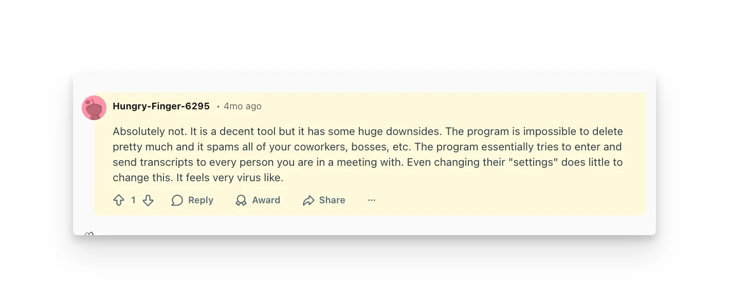 - Reddit sentiment is mixed in 2026. Users praise transcription accuracy but complain about aggressive auto-join behavior and email spam to meeting participants.