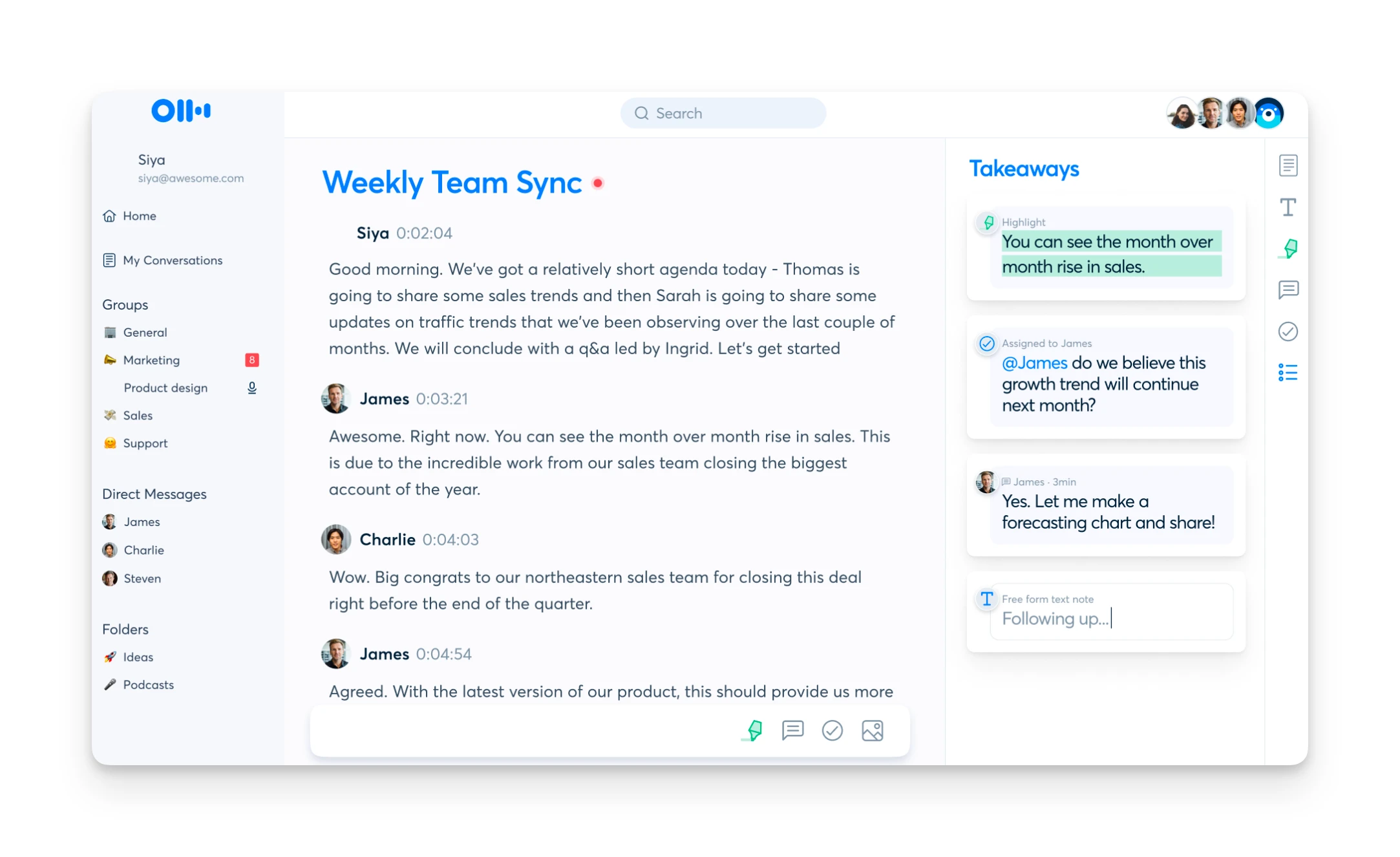| Collaboration | Channels for team organization, shared transcripts, comments |